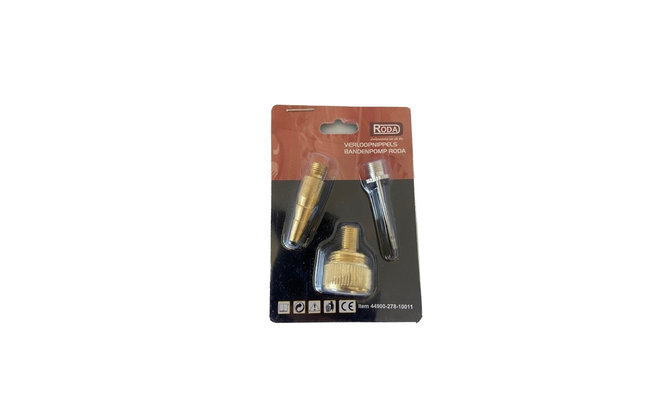 - Verloopnippels bandenpomp Roda 3-deligAanbiedingsprijs € 4,83 € 3,99 Normale prijs € 6,04 € 4,99